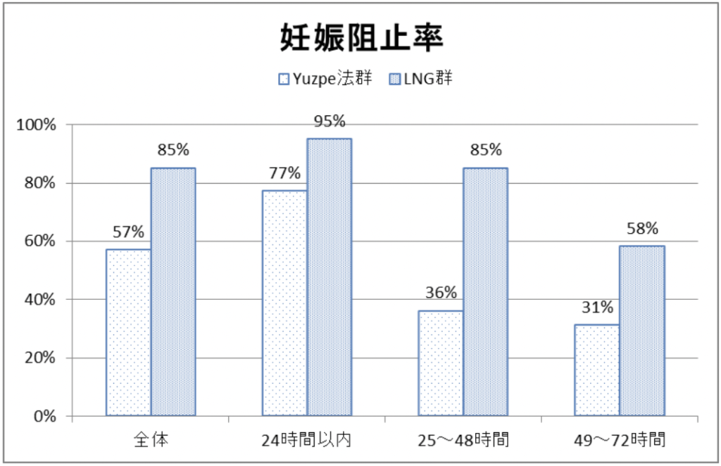 緊急避妊薬であるアフターピルは、種類によってその効果は変わるのでしょうか。下記のグラフは、レボノルゲストレル(LNG)とヤッペ法(Yuzpe法)の妊娠阻止率を比べたものです。