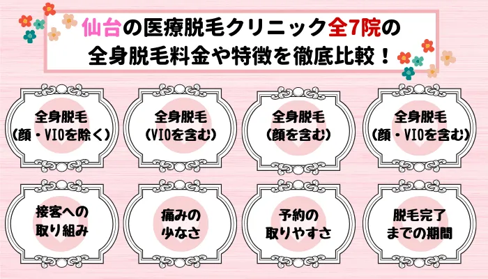 早速、仙台で全身脱毛プランがある医療脱毛クリニック全7院の比較表を見ていきましょう。