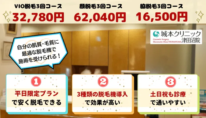 城本クリニックには、平日限定でお得に脱毛できる3回コースがあります。