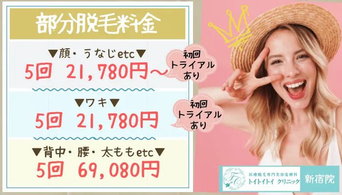 トイトイトイクリニックでは、ワキ・鼻下・手指のいずれか1カ所を[affi id=685]、もしくはVラインを[affi id=3789]でお試し脱毛することができます。