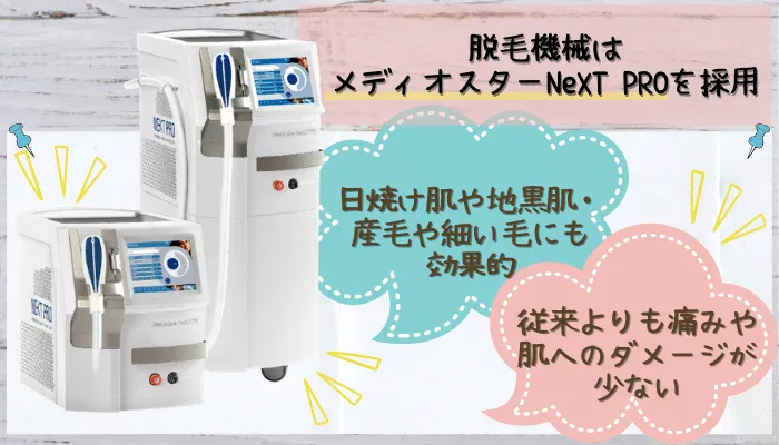 脱毛機械はメディオスターNeXT PROを採用|日焼け肌や地黒肌・産毛や細い毛にも効果的
