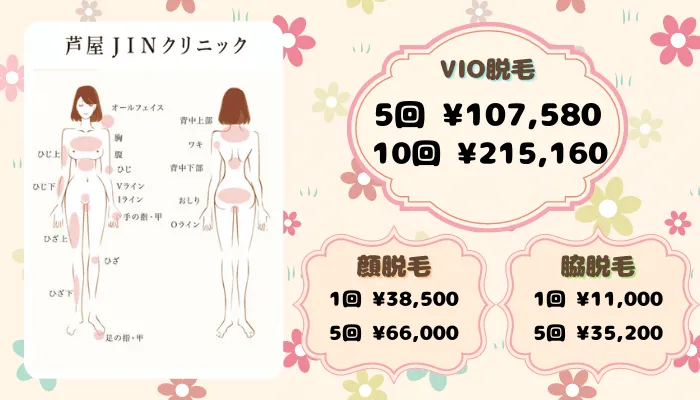 芦屋JINクリニックのVIO脱毛・顔脱毛・脇脱毛料金