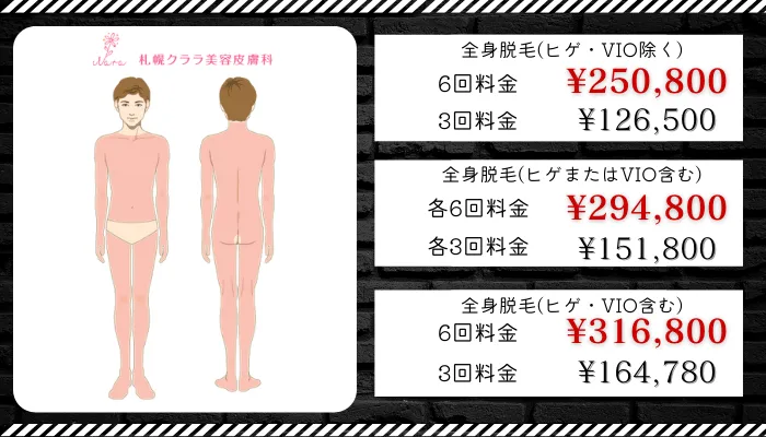続いて、札幌クララ美容皮膚科の全身脱毛料金とオプション料金を紹介していく。