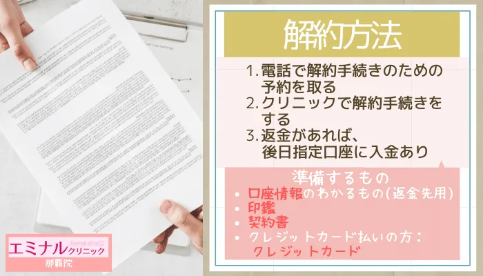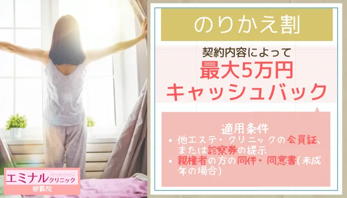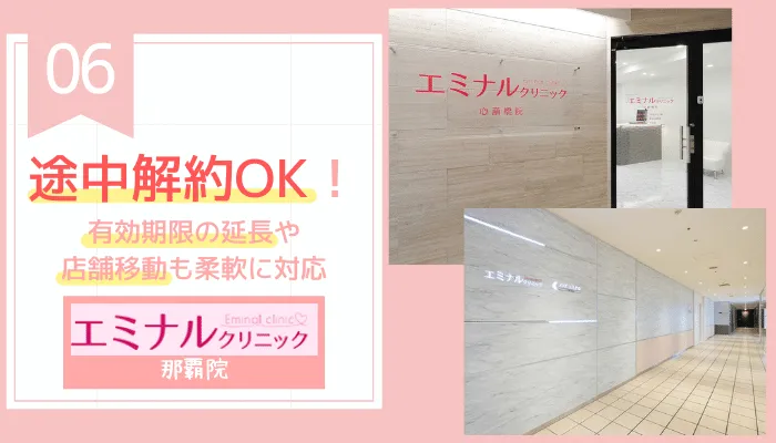 何度か施術してもらい結果に満足した場合や、引っ越しなどで那覇院に通うのが難しくなってしまった場合、エミナルクリニックは契約期間内であれば途中解約が可能です。 未消化分の料金は、きちんと返金されるので、ご安心ください。