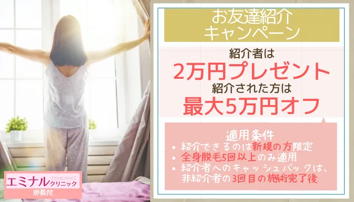 はじめに総評をお伝えすると、エミナルクリニック那覇院は全身脱毛を格安で受けられるおすすめの医療脱毛クリニックです。