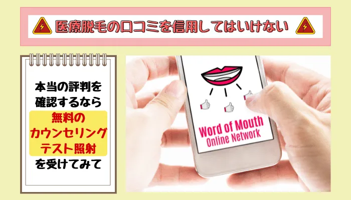 脱毛効果や痛みの感じ方など、施術を受けてどう感じるかには個人差が大きいため、他人の口コミはあまり参考にならないことを覚えておいてください。
