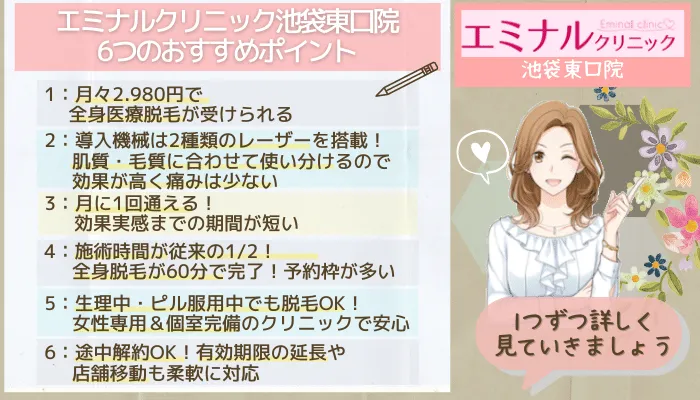 最初に総評をまとめると、エミナルクリニック池袋東口院は全身脱毛を安く受けたい方におすすめの医療脱毛クリニックです。