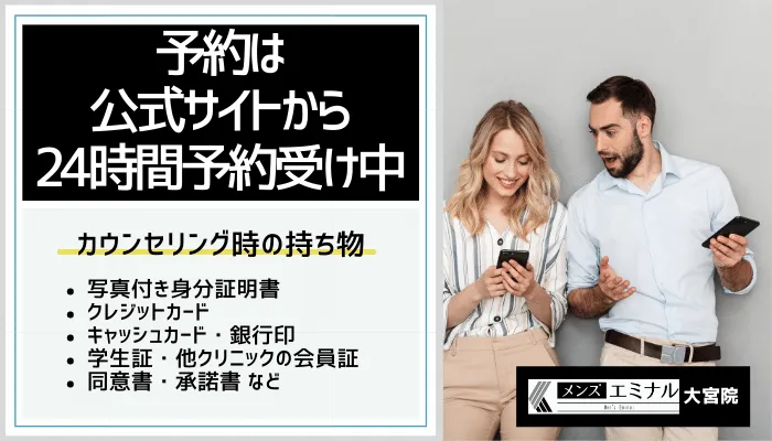続いて、エミナルクリニックメンズ大宮院の予約の取り方について紹介する。