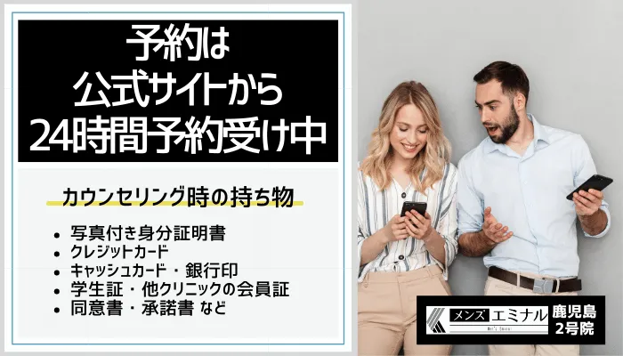 エミナルクリニックメンズ鹿児島2号院のカウンセリングと施術の予約方法について紹介する。