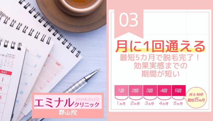 エミナルクリニックは、最短1ヶ月に1回のペースで脱毛施術を受けられます。