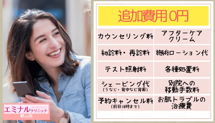 エミナルクリニック郡山院は、顔とVIOを除く全身脱毛が月々1,000円で施術できるなど支払いの負担が少なく通いやすいクリニックです。