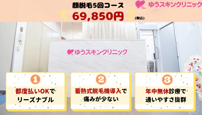 ゆうスキンクリニックは、土日や祝日でも通いやすいように年中無休で診療を受け付けているので、無理なくスケジュール調整しながら通えます。