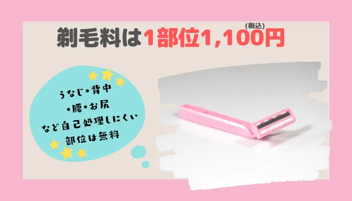 両腕上・両腕下・両脚上・両脚下 胸・おなか・うなじ・背中上・背中下・おしり 顔(おでこ・ほほ・鼻下・あご・あご下)・VIO |