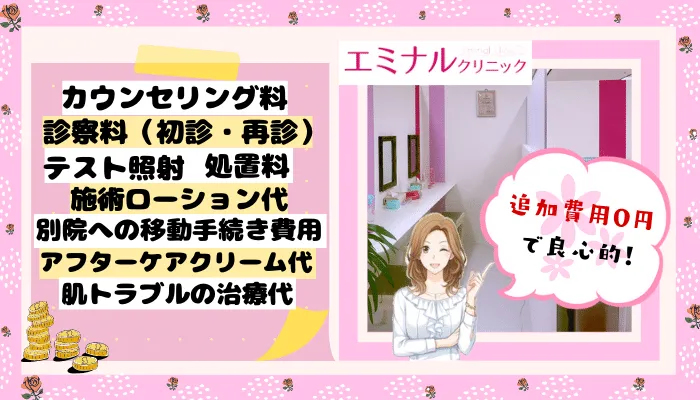 続いて、エミナルクリニック渋谷院の追加費用を確認しておきましょう。エミナルクリニックでは、他のクリニックで請求されることの多い、以下の追加費用が全て無料です。