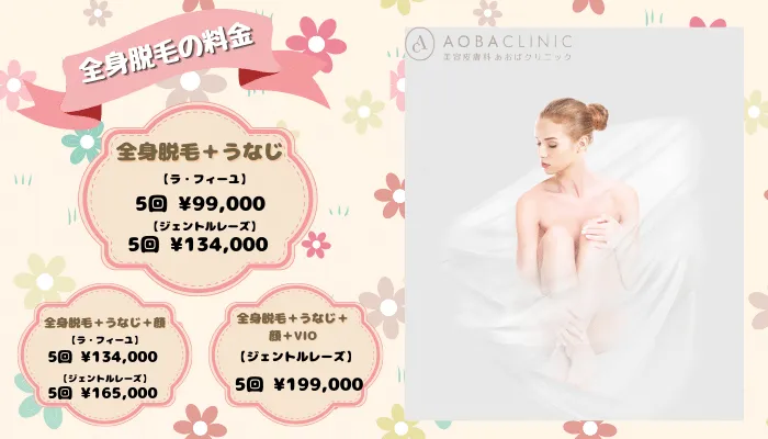 VIOを除く肩から下の全身をまとめて脱毛できる5回コース総額が[affi id=4364]、60回の分割払いなら月々[affi id=4424]の負担でスタートできます。