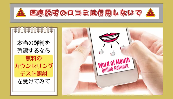 インターネット上では、医療脱毛に関する様々な口コミが確認できますが、口コミの内容は信用しないでください。
