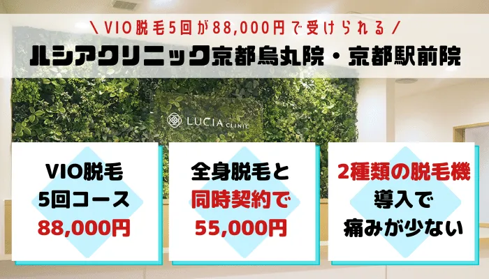 ルシアクリニック京都烏丸院・京都駅前院』は、VIO脱毛5回コースを88,000円で受けられる医療脱毛クリニックです。