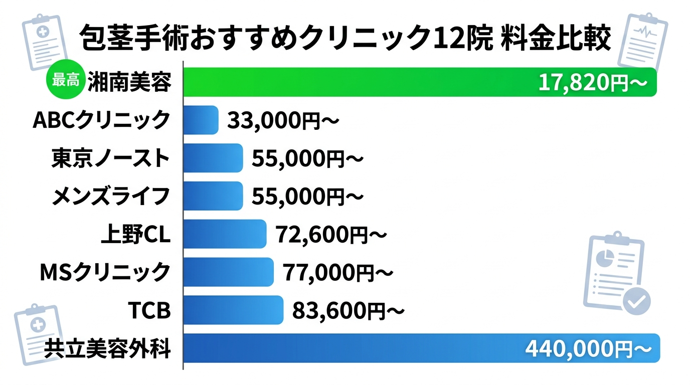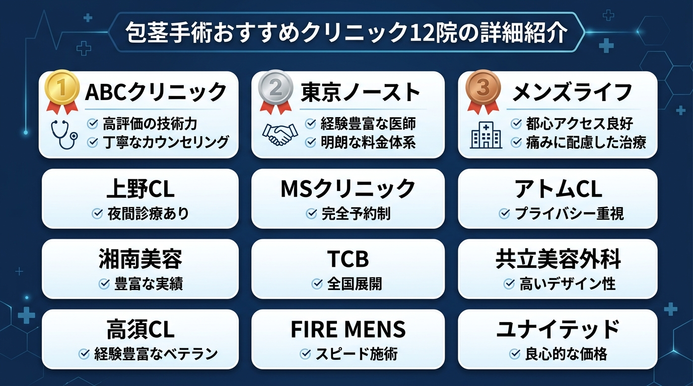 この記事では、包茎手術を検討している方に向けて、料金・術式・口コミ・保証制度の4軸で12院を徹底比較しています。「どのクリニックが自分に合うか」「費用はいくらかかるか」「術式による仕上がりの違い」まで、この1ページで判断できます。