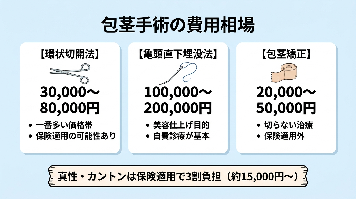 真性包茎やカントン包茎で機能上の問題がある場合は保険適用の可能性があります。泌尿器科(保険医療機関)を受診して、医師の判断を仰いでください。仮性包茎は美容目的とみなされるため原則として保険適用外です。保険適用の場合、3割負担で約20,000〜30,000円が目安です。