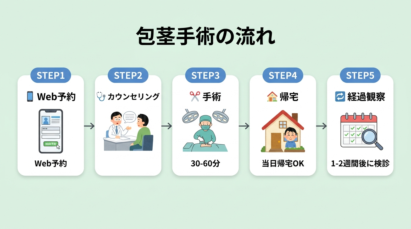包茎手術の流れを5ステップで解説します。「初めてで何をするかわからない」という方は、この流れを把握しておくと安心してカウンセリングに臨めます。