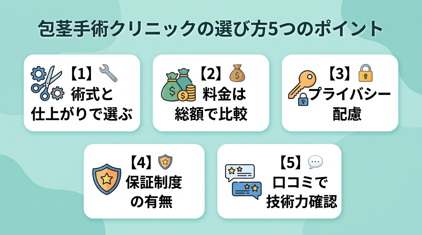 包茎手術は一度受けたらやり直しがきかない手術です。クリニック選びを間違えると、仕上がりに満足できなかったり、追加費用が発生したりするケースがあります。以下の5つのポイントを押さえてから選んでください。