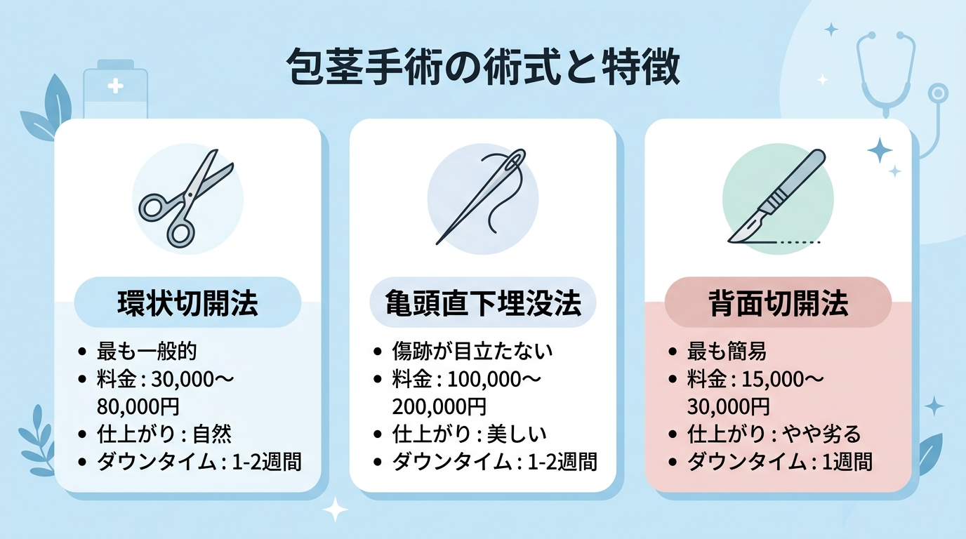 包茎手術には主に3つの術式があります。それぞれ仕上がり・費用・手術時間が異なるため、自分の希望に合った術式を提供しているクリニックを選ぶことが重要です。