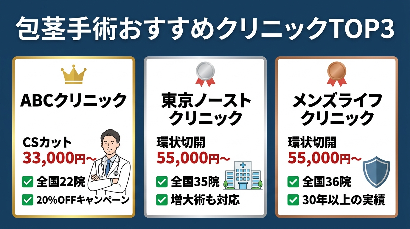 本記事は、包茎手術を提供する主要クリニック20院以上を対象に、公式サイトの料金表・術式・保証制度・口コミ評判を2026年3月時点で独自調査した結果をもとに作成しています。料金は税込表記で、各クリニック公式サイトの最新情報を参照しています。当サイトはアフィリエイトプログラムに参加しており、紹介クリニックへの申込が発生した場合に報酬を受け取ることがあります。ただし、掲載順位や評価内容が報酬額によって左右されることはありません。