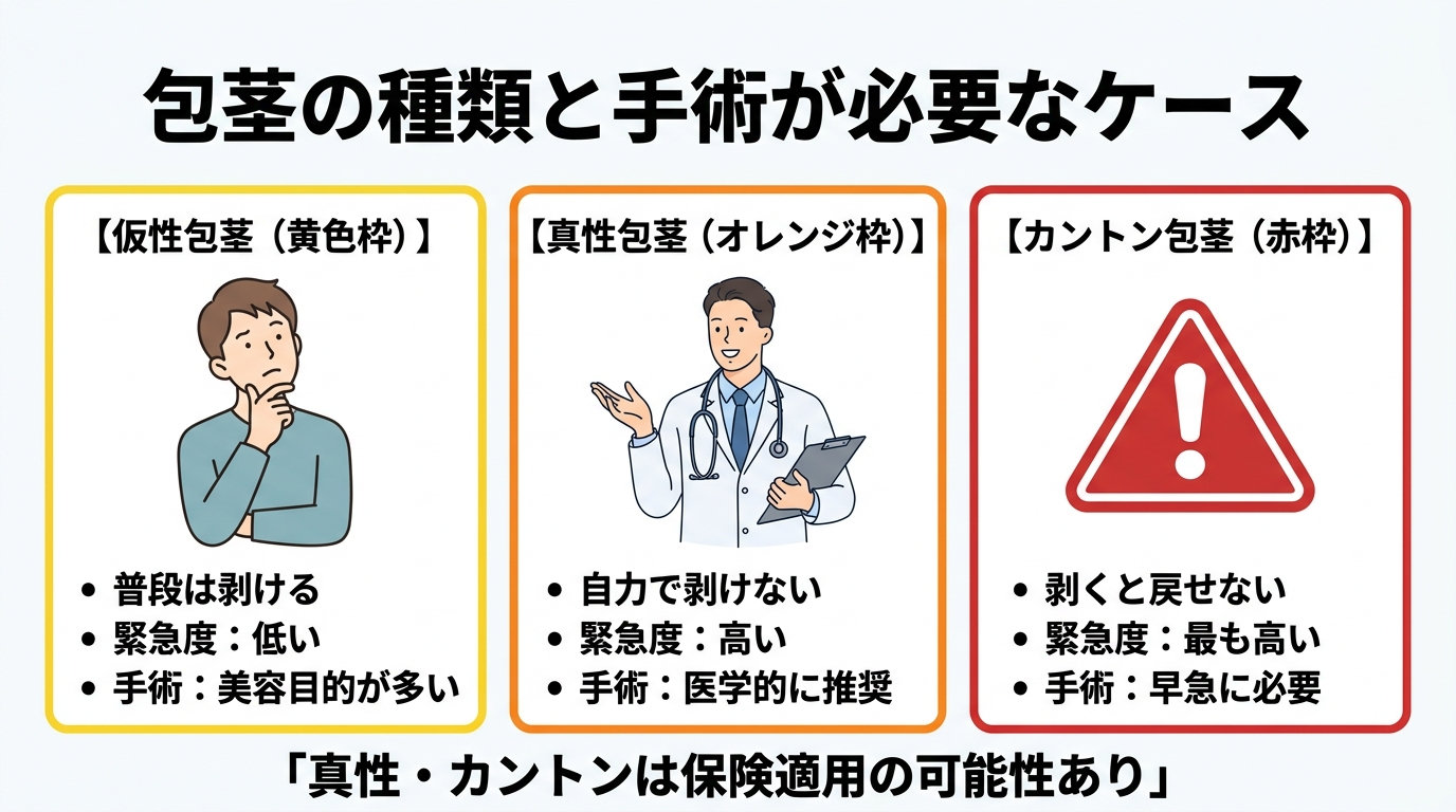 包茎手術を検討する前に、まず自分がどのタイプの包茎に該当するかを把握しましょう。包茎には大きく3つのタイプがあり、手術の緊急度・保険適用の可否がタイプによって異なります