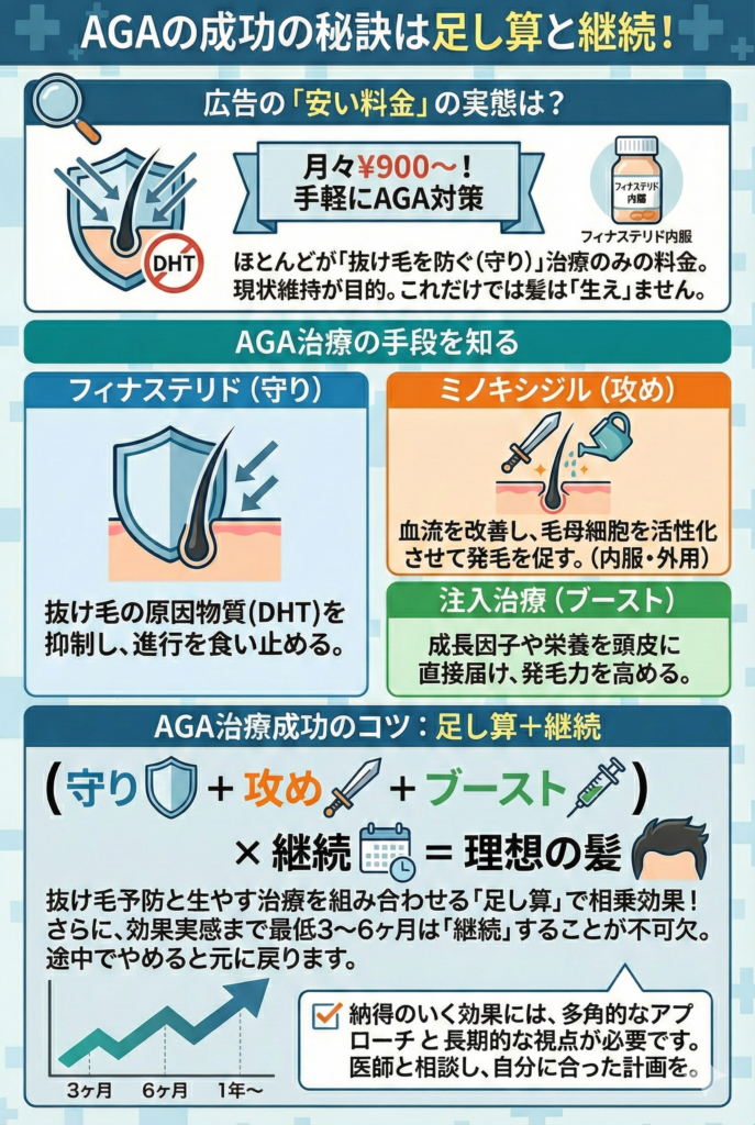 無理な勧誘がなく自分のペースで始められることや、実際に効果を実感できているという声が寄せられています。AGA治療は継続が大切なので、納得して通えるクリニックを選ぶことが成功への第一歩ですね。